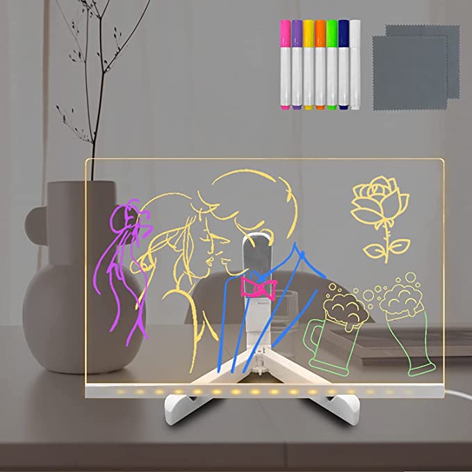 - High-quality + Unique design :Â Dry erase boards has made of premium quality clear acrylic, environmentally-friendly, durable and long-lasting that is to be erased, and not easy to leave stains and dents. Bottom luminous design adds a full sense of atmosphere to the message board, The base bracket can be retracted at will, convenient to carry.Â