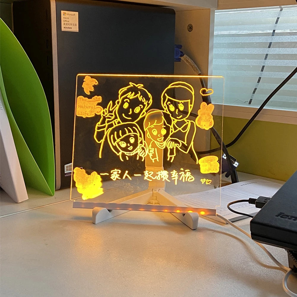 - Easy to use :Â USB interface, The base is illuminated, and the board is bright after putting it on. Use erasable pens or whiteboard pens (erasable pens of various colors can be used) to record life or memos on the blank acrylic board. The quick-drying ink prevents fading and smearing, so your notes can be kept as needed. Just wipe it with a damp cloth or wet paper towel.Â