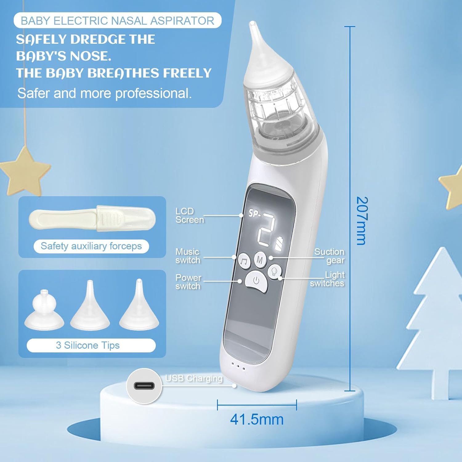 High-quality motor runs quietly (<65 dB) with relaxing music that helps calm and distract your baby during use — so nasal care feels stress-free.
